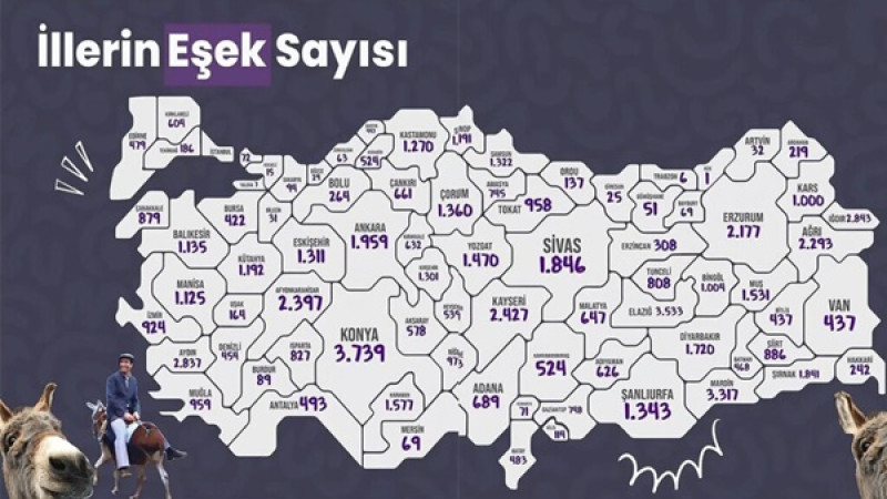 Halk arasında “karakaçan” olarak bilinen eşeklerin en fazla bulunduğu il ise Konya oldu. Konya’da toplam 6 bin 238 eşek bulunurken, bu ili sırasıyla şu iller takip etti: