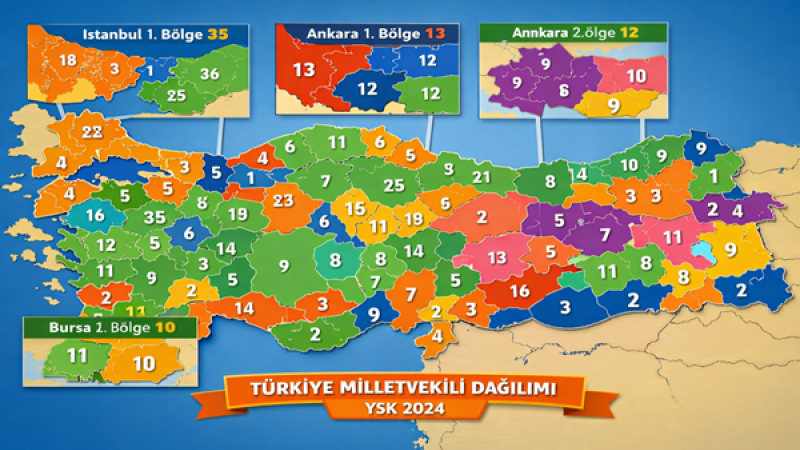 YSK kararında illerin milletvekili sayıları şu şekilde sıralandı: Adana 15, Adıyaman 5, Afyonkarahisar 6, Ağrı 4, Amasya 3, Antalya 18, Artvin 2, Aydın 8, Balıkesir 9, Bilecik 2, Bingöl 3, Bitlis 3, Bolu 3, Burdur 3, Çanakkale 4, Çankırı 2, Çorum 4, Denizli 7, Diyarbakır 12, Edirne 4, Elazığ 5, Erzincan 2, Erzurum 5, Eskişehir 7, Gaziantep 14, Giresun 4, Gümüşhane 2, Hakkari 3, Hatay 10, Isparta 4, Mersin 13, Kars 3, Kastamonu 3, Kayseri 10, Kırklareli 3, Kırşehir 2, Kocaeli 14, Konya 15, Kütahya 4, Malatya 6, Manisa 10, Kahramanmaraş 8, Mardin 6, Muğla 8, Muş 3, Nevşehir 3, Niğde 3, Ordu 6, Rize 3, Sakarya 8, Samsun 9, Siirt 3, Sinop 2, Sivas 5, Tekirdağ 8, Tokat 5, Trabzon 6, Tunceli 2, Şanlıurfa 15, Uşak 3, Van 8, Yozgat 3, Zonguldak 5, Aksaray 4, Bayburt 1, Karaman 3, Kırıkkale 3, Batman 5, Şırnak 4, Bartın 2, Ardahan 2, Iğdır 2, Yalova 3, Karabük 2, Kilis 2, Osmaniye 4, Düzce 3.